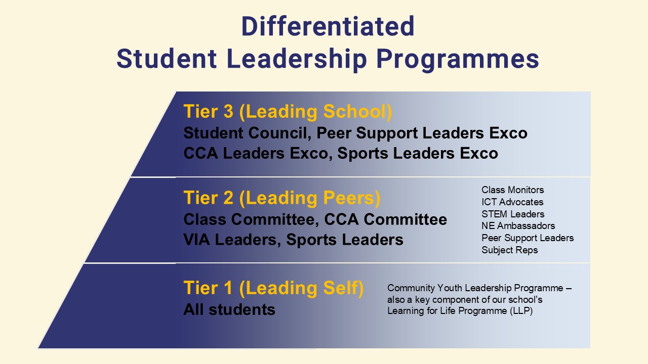 At Tier 1, all students undergo the Community Youth Leadership programme, which focuses on developing self-leadership skills and aims to equip every student with the tools to lead themselves effectively. The signature CYL programme is also a key components of our school’s Learning For Life Programme (LLP).